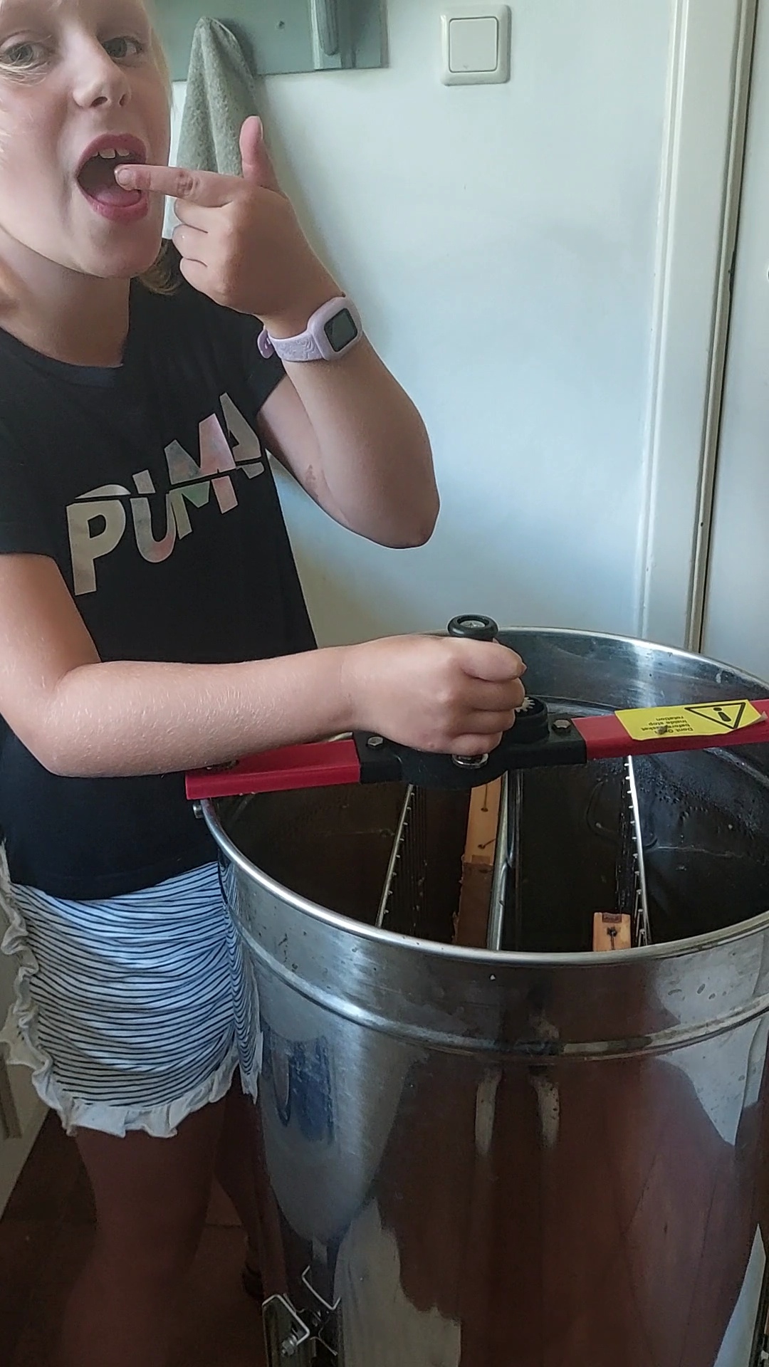 Kleindochter Nora had al eens aangegeven dat ze ook graag honing wilde slingeren. Op zondag deed ik een de bijenuitlaat onder de honingkamer zodat we op maandag de kamer zonder al teveel gedoe van de bijenkast konden halen. Grandpa haalde Nora maandagochtend op uit Zwolle (ikea :) , ze gingen eerst samen naar de kapper, daarna maakten ze me om 12.00 uur wakker. Na de lunch togen we aan het werk de honingslinger werd schoongemaakt, de keuken moest ook een lap, hygienisch werken lieve mensen.